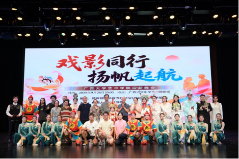 9月26日晚,汇学堂菊隐厅灯光璀璨、掌声雷动,“戏影同行 扬帆起航”广西大学艺术学院2025级迎新晚会在这里精彩上演。本次晚会节目涵盖戏剧、戏曲、歌舞等多种艺术形式,首次引入融合现代科技的数字主持人主持晚会。晚会展现了艺术学院学生的专业素养和创新活力,让新生们感受到艺术的魅力,为大学生活的开启注入了激情与活力。